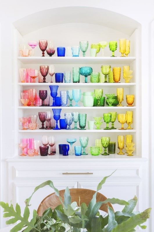 Odpravite se v starinarnico (ali na babičino podstrešje) in poiščite kozarce s peclji v barvi sladkornih bonbonov in jih postavite na police. Razporedite jih po barvah, višini ali na kakršen koli drug način, ki je prijeten na pogled.